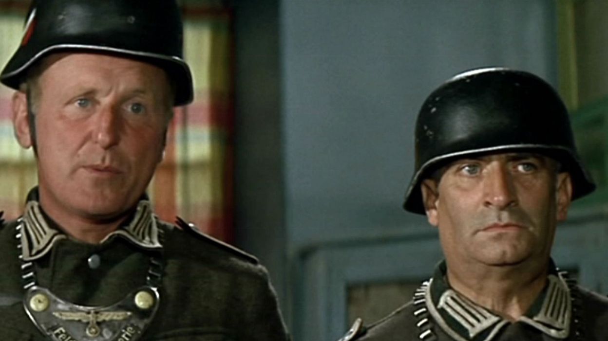 Or when Bourvil and de Funès imitate them in their ill-fitting SS uniforms, which is hilarious because they retain only the most ridiculous Nazi features in their imitation, i.e. their robust, falsely refined allure as they spout «Ja, ja, ja» with a smile or «Heil Hitler!» with a stick up their ass, or when they scream incomprehensibly to make a point. as if. The comedy is both behavioral and linguistic. Where does this widespread comic usage of shouting a Germanic-sounding language to imitate the Nazis come from? Nazi military language. As supermen, soldiers have to shout, even if nobody understands them.